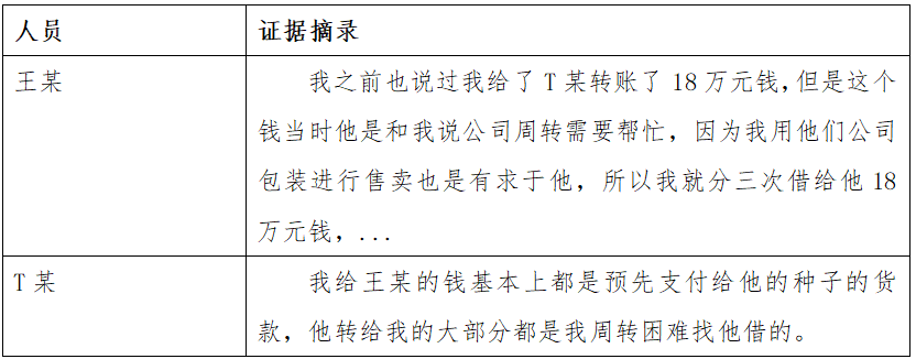 通过上述陈述可以看出,T某与王某进行的经济往来包括预先支付种子货款以及公司经营周转,这也表明了T某对于Y公司的对外经济活动始终使用个人银行卡进行支付、收入,那么对于15万元的支付费用无法确定是T某的个人所得。