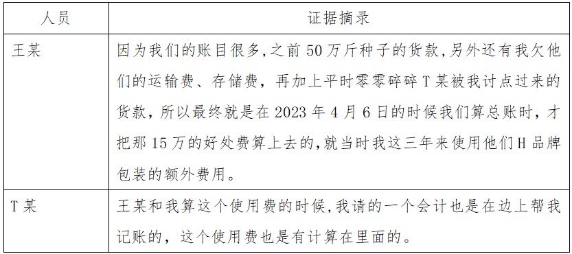 2023年4月6日,王某前往四川与T某进行账目清算,两人就种子的货款问题,以及“H”商标使用费用的问题达成一致意见,约定将15万元费用从Y公司所欠货款中予以抵销。