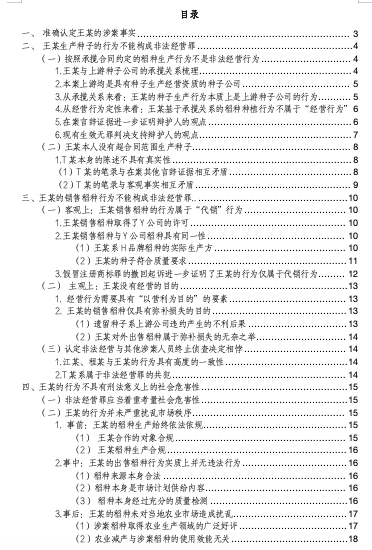 被告人席上不仅包括了王某,还包括了被害人公司的法定代表人,这一独特的构成恰恰反映了本案系刑事法律过度干预民事领域的重要标志。在这个案件中,王某生产了真实的Y公司的种子,并且取得了Y公司的同意,缴纳了商标使用费,这种行为是否能够构成刑法意义上的“假冒注册商标罪”?依然是值得我们思考的问题。在此辩护人肯定合议庭充分考虑本案的性质,考量王某的行为,为本案所有被告人作出一个公正的判决,依法判决全案无罪!